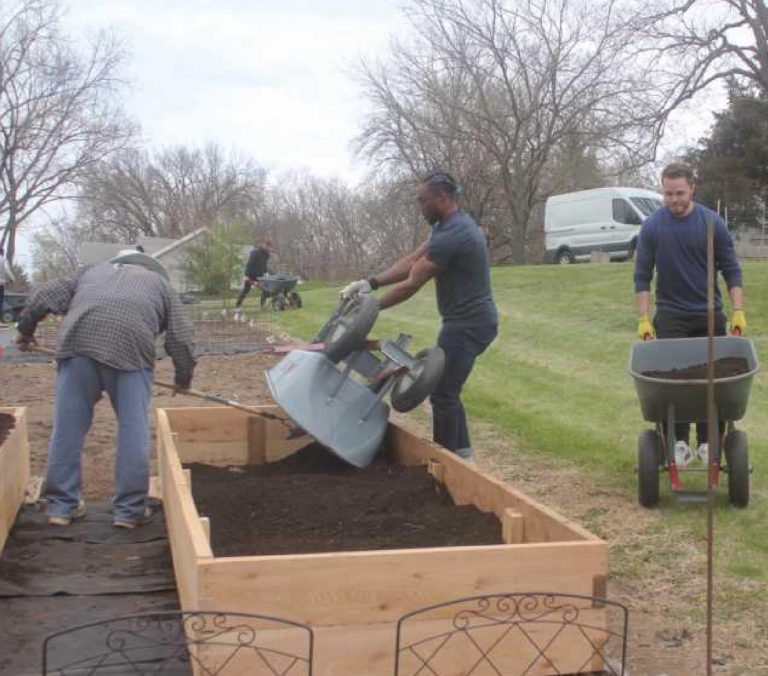 Players and staff from the Sporting Kansas City soccer team, as well as member of the Greater Kansas City Community Gardens more than a dozen volunteers total worked with some regular gardeners Tuesday afternoon to spruce up the Sugar Creek Community Garden. The effort by Sporting KC is part of Major League Soccer’s annual Greener Goals of Service Week. Volunteers helped build and fill two new raised beds for the Sugar Creek garden, as well as enhance its existing raised beds. Sugar Creek’s Community Garden has been used for nine years now, co-director Sandy Mikulich said, and has a similar number of regular gardeners renting spots. The city donates the land on Kentucky Avenue just east of Sterling Avenue, Mikulich said, and the gardeners maintain it. [MIKE GENET/THE EXAMINER]