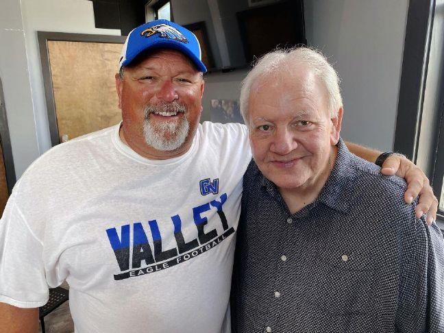 Former Grain Valley football coach Forrest Rovello, right, poses with current head coach David Allie at the 100th anniversary celebration party Saturday at Iron Kettle in downtown Grain Valley. Rovello won school-record 133 games as the Eagles' head coach before retiring. Photo Credit: Bill Althaus/The Examiner