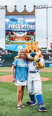 Longtime Blue Springs girls golf coach Jill Courter poses with Royals mascot Sluggerrr after throwing out the ceremonial first pitch prior to the Royals' game against Arizona on July 23 at Kauffman Stadium. Courter was selected as the Blue KC Coach of Character for July. Photo Credit: Photo courtesy of Jill Courter