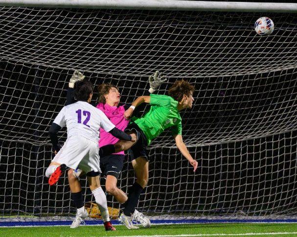 Blue Springs midfielder Walter Inestroza Jr. (12) scores on a header in the 25th minute in the Class 4 District 7 championship game against Columbia Rock Bridge Monday at Blue Springs South. Inestroza's goal put th Wildcats ahead 1-0, but they went on to lose 2-1, ending their season. Photo Credit: David M. Rainey/Special to The Examiner