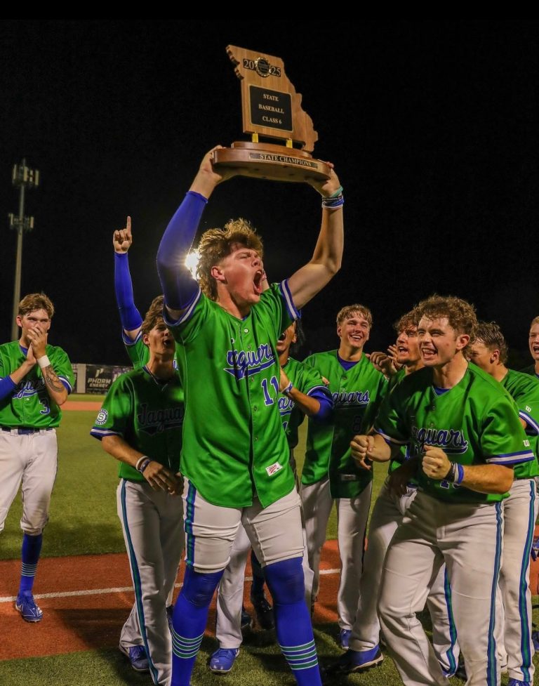 Blue Springs South senior Ashton Nance hoists the Class 6 state championship trophy as teammates celebrate following the Jaguars' come-from-behind 8-6 victory over Staley in the state championship game Saturday night at the Ozark Mountain Sports Complex in Ozark, Mo. Photo credit: Photo courtesy of Blue Springs South baseball
