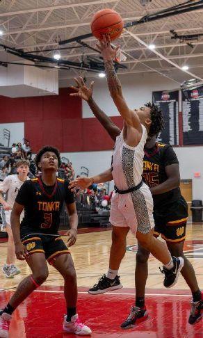 Fort Osage's Mario Canady, front right, drives to the hoop for a basket in Tuesday's home game against Winnetonka. Canady scored 12 of his team-high 20 points in the fourth quarter but the comeback fell short in a 64-62 loss to the 10th-ranked Griffins. Photo Credit: David M. Rainey/Special to The Examiner