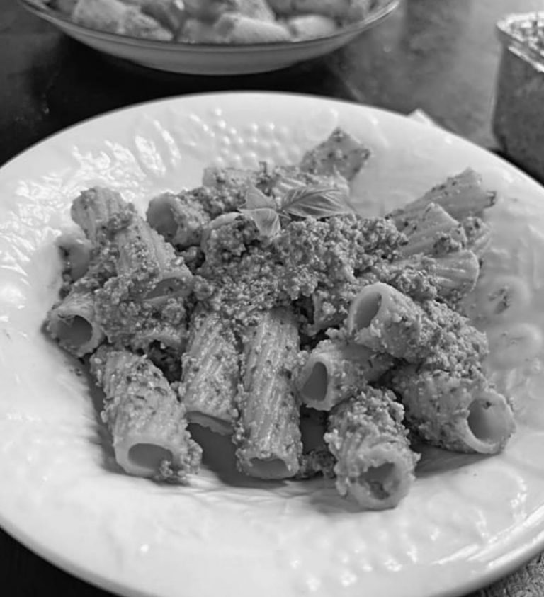 PG tested | Serves 6-8 • 1/4 cup slivered almonds, toasted • 1/4 cup cashews, toasted • 1 clove garlic, peeled and smashed • 1 large handful basil leaves, about 1 cup packed • 1 pint cherry or grape tomatoes, halved, with a few reserved for garnish • Pinch or two of kosher salt • 1/4 cup extra-virgin chili pepper olive oil • 1/4 cup extra-virgin olive oil • 1/2 cup freshly grated Parmesan cheese, plus more for serving • 1 pound cooked rigatoni, warm or room temperature Place almonds and garlic in the bowl of a food processor or blender, and pulse together until finely chopped. Scrape down sides of the food processor with a rubber spatula.