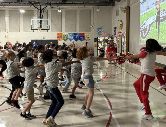 Cheered along by Chiefs mascot KC Wolf and others, third and fourth graders at Three Trails Elementary School in Independence followed along with a 15-minute video produced by the National Football League and American Heart Association’s PLAY 60 initiative.