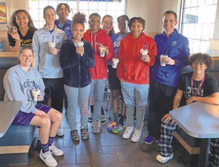 The Blue Springs South Jaguars enjoyed the sweet taste of success, along with the exhilaration of being the first girls basketball team in school history to make it the state final four. They were rewarded for their 25-4 season Tuesday afternoon with some sweet treats and post-practice conversation, and they were joined by head coach Kory Lower, assistant varsity coach Kurt Lower, his older brother, and assistant coach Katie Bubalo, a former South standout guard.