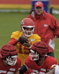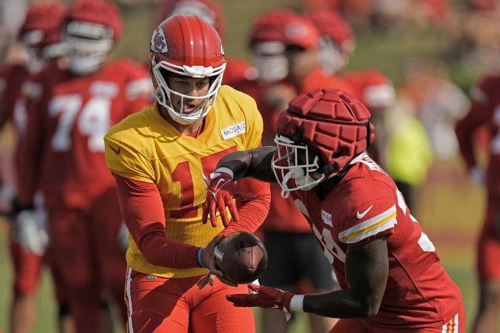 Chiefs quarterback Patrick Mahomes hands the ball to running back Deneric Prince, right, during training camp in St. Joseph. The Chiefs continue to find cheap running backs for their prolific offense. Photo Credit: Charlie Riedel/AP
