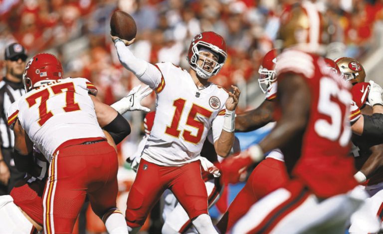 Kansas City Chiefs quarterback Patrick Mahomes (15) throws a pass against the San Francisco 49ers during Sunday’s game in Santa Clara, Calif. Mahomes and the Chiefs head into the bye week in first place in the AFC West with a 5-2 record against a tough schedule. JED JACOBSOHN/AP