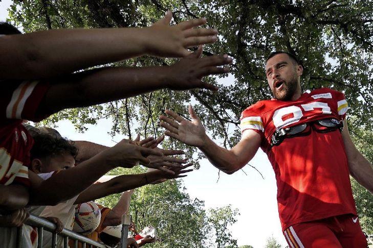 Kansas City Chiefs tight end Travis Kelce greets fans before training camp practice Friday in St. Joseph. It was the first day in full pads for the Super Bowl champions. Photo Credit: Charlie Riedel/AP