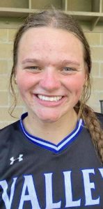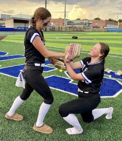 Grain Valley starter Molly Jones, left, and Makenna Moore have some fun following a 5-0 win over Truman. Moore pitched five shutout innings and Moore struck out six in two innings of relief. Photo Credit: Bill Althaus/The Examiner