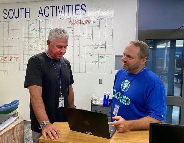 Jimmy Cain, left, is the new activities director at Blue Springs Sough High School. His longtime friend Ben Baier, the Jaguars baseball coach, will be Cains new assistant AD. Former activities director Jon Grice left the position two weeks ago. Cain moved up from his role as an assistant to take over that position. They officially begin their new roles July 1. Photo Credit: Bill Althaus/The Examiner