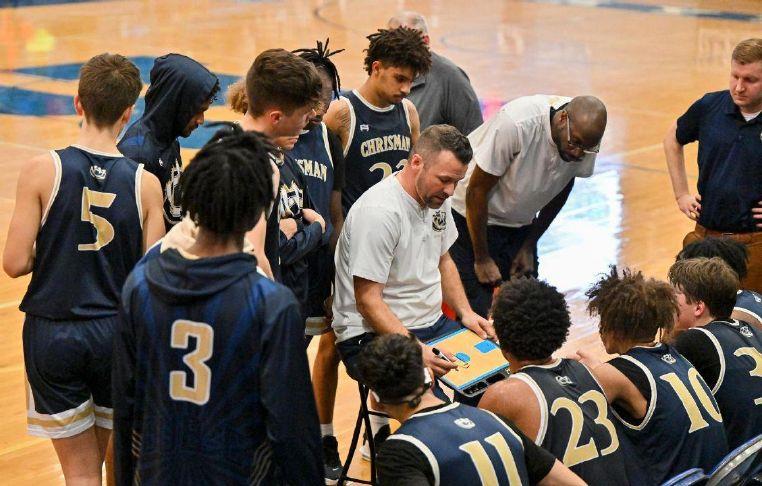 Jake Kates draws up a play for his William Chrisman High School boys basketball team during a timeout in the 2022-23 season. Kates, who resigned as coach a few months ago, has been hired as an assistant coach for the Division I UMKC men's team. Photo Credit: David M. Rainey/Examiner file photo