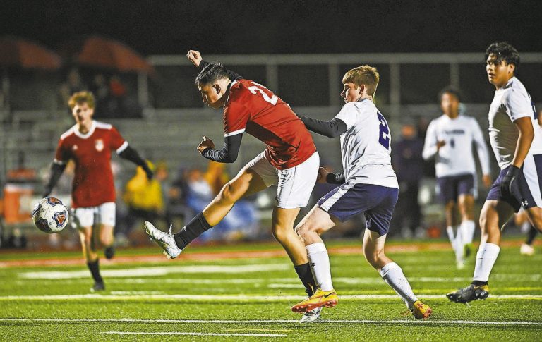 Fort Osage’s Mateo Castillo, center, gets a shot off under pressure from Oak Park’s Owen Boswell (2) in Monday’s Suburban Red Conference battle. Fort Osage fell short of claiming its first boys soccer conference title with a 1-0 loss in overtime. PHOTOGRAPHY BY DAVID M. RAINEY/SPECIAL TO THE EXAMINER