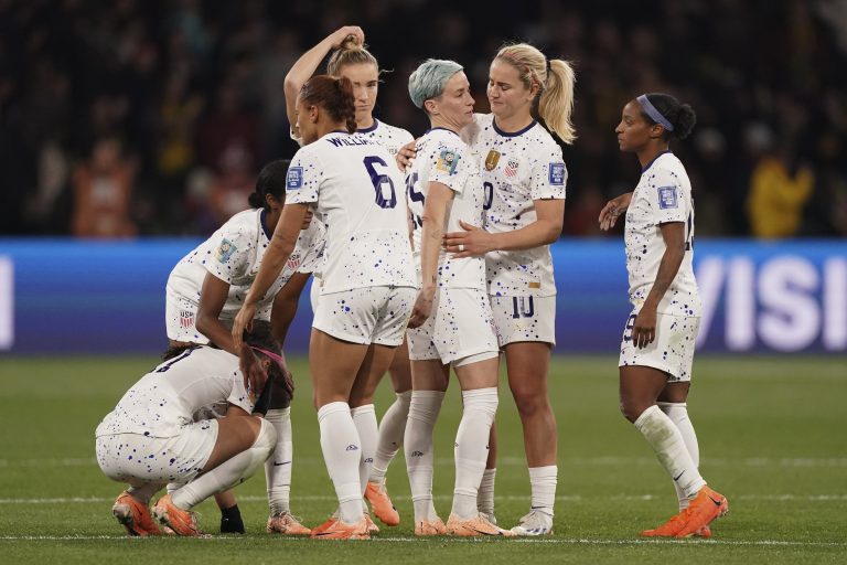 US players react following their loss to Sweden in a penalty shootout during the Women's World Cup round of 16 soccer match in Melbourne, Australia, Sunday, Aug. 6, 2023. (AP Photo/Scott Barbour)