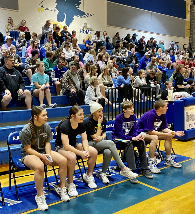 More than 500 people attended the Totta Tournament on Monday afternoon at Grain Valley High School. Fourteen teams competed in the double-elimination tournament, with members of the Eagles boys and girls basketball teams serving as coaches, officials and broadcasters. Totta, seated on the bench in the stocking cap, was diagnosed with cancer in late 2023. The event raised close to $4,000. [BILL ALTHAUS/THE EXAMINER]