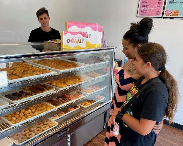 OG Donut shopâs Amaro Silva helps Grain Valley residents Cindy Beauvais and her daughter Raia select doughnuts at the shop's new location in Grain Valley. [[Bill Althaus/The Examiner]