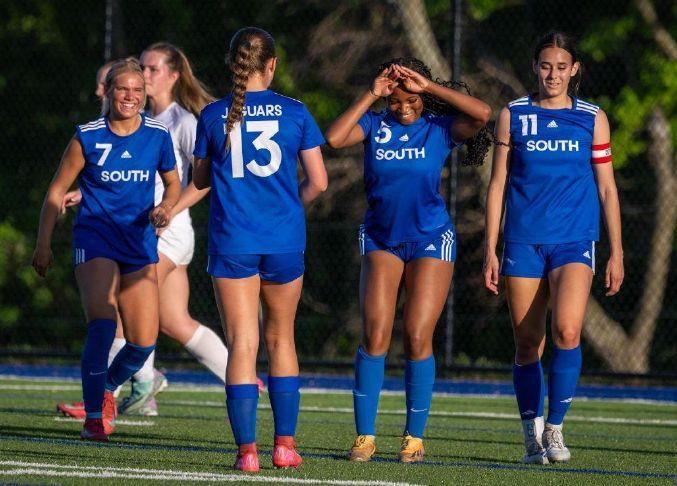 Blue Springs South's Kayleb Garrett, second from right, dances to celebrate with teammates Haley Cramer (7), Lexi Edwards (13) and Norah Oyler (11) after scoring on a header in their home game against Lee's Summit North Tuesday. Garrett scored two goals to help the Jaguars to a 5-1 win that put them in first place in the Suburban Gold Conference. Photo Credit: David M. Rainey/Special to The Examiner