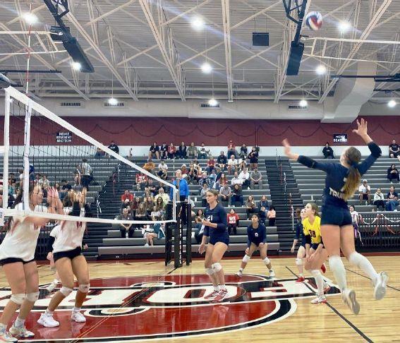 Truman's Jayden Herl, right, leaps to hit a spike in Tuesday's match at Fort Osage. Herl and the Patriots claimed a 3-0 Suburban White Conference win over the host Indians. Photo Credit: Bill Althaus/The Examiner