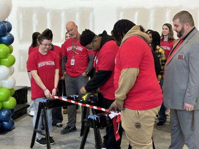 In lieu of cutting a ribbon, a Fort Osage students sawed a board Wednesday to mark the opening of the Fort Connect education space at NorthPoint Development's Eastgate Commerce Center. The space is in one of first two of several industrial and commercial buildings NorthPoint plans to construct in the Little Blue Valley, and the ceremony preceded City Manager Zach Walkerâs state of the city address during a Chamber of Commerce luncheon. Read more about Fort Connect in Friday's edition of The Examiner. [Mike Genet/The Examiner]