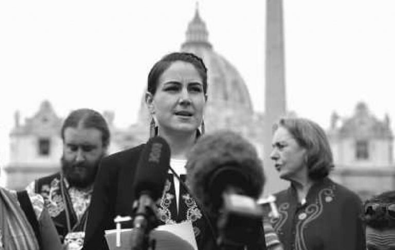 President of the Metis community, Cassidy Caron, speaks to the media in St. Peter’s Square after their meeting with Pope Francis at The Vatican, Monday. (AP PHOTO/GREGORIO BORGIA)