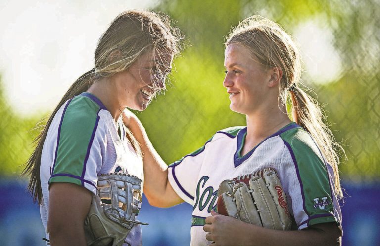Blue Springs South senior Abbie Wilhelm, left, shares a laugh with junior Madison Hoffman during a game earlier this season. One of the two, or junior Maddy Duvall, could be the starting pitcher for the Jaguars in today’s Class 5 state quarterfinal matchup against Ozark at South. DAVID M. RAINEY/EXAMINER FILE PHOTO
