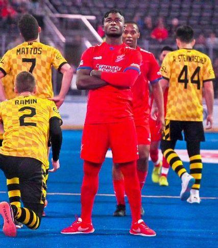James Togbah, center, posing after scoring a goal last season, has been traded by the Kansas City Comets to the St. Louis Ambush for cash considerations. Photo Credit: David M. Rainey/Examiner file photo