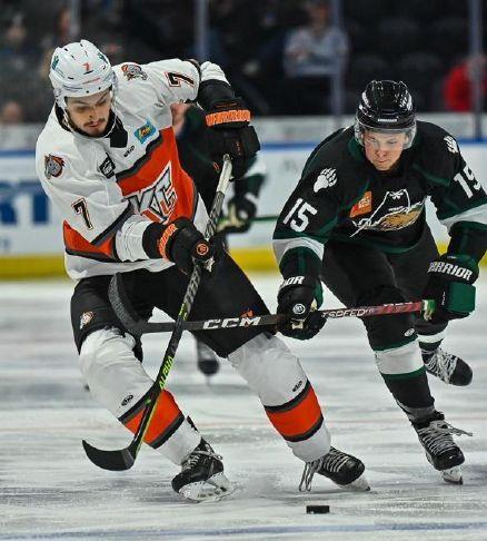 Defenseman Theo Calvas, left, has re-signed with the Kansas City Mavericks for the 2023-24 season. Photo Credit: David M. Rainey/Examiner file photo