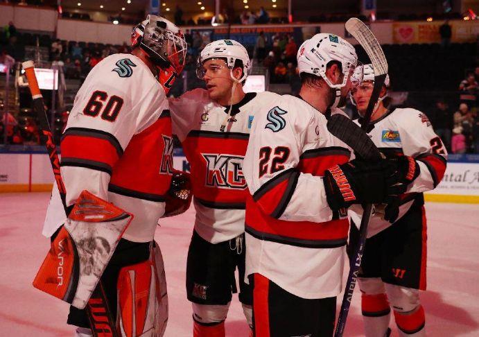 Kansas City Mavericks forward Patrick Curry, second from left, congratulates goalie Dillon Kelley (60) after a 6-4 victory over the Allen Americans Wednesday at Cable Dahmer Arena. Curry scored four goals and had two assists to set the franchise record for points in a single game and Kelley won his first start in a month. Photo Credit: Courtesy of Kansas City Mavericks