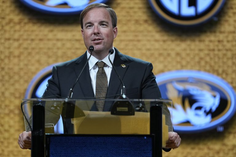 Missouri head coach Eliah Drinkwitz speaks during NCAA college football Southeastern Conference Media Days, Monday, July 17, 2023, in Nashville, Tenn. (AP Photo/George Walker IV)