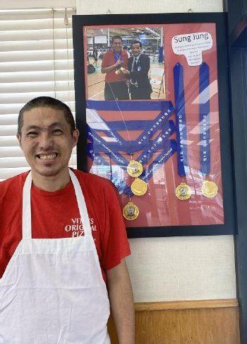 Sung Jung is all smiles as he stands next to a display case that features the five gold medals he won at a recent Korean Special Olympics event at Gardner, Kansas. The medals at on display at Original Pizza on Missouri 7 in Blue Springs, where Sung has worked since 2008. Photo Credit: Bill Althaus/The Examiner