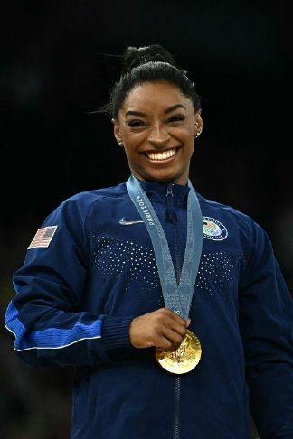U.S. gymnast Simone Biles flashes her gold medal and a winning smile after leading the Americans to the Olympic title Tuesday in Paris. Photo Credit: LIONEL BONAVENTURE/AFP via Getty Images/TNS
