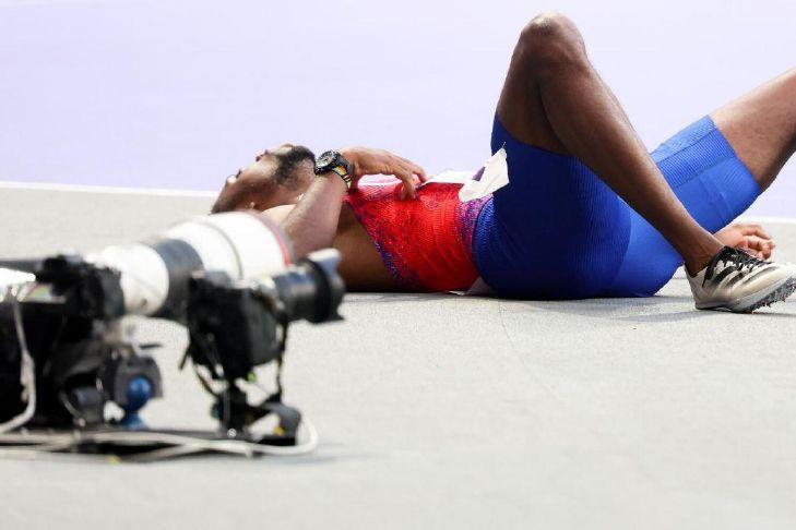 Noah Lyles of the United States lays on the track after winning the bronze medal in the Olympic 200-meter final Thursday in Paris. Lyles, the 100-meter champion, later confirmed that he ran the 200 after being diagnosed with COVID-19 two days earlier. Photo Credit: Wally Skalij/Los Angeles Times/TNS