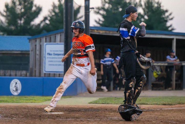 Oak Grove's Caden Gann scores on a two-run single by Ford Greaves in the fifth inning of Monday's game against Eureka Post 177 in an elimination game in the Missouri State American Legion Tournament at Hidden Valley Park. Oak Grove pulled within 5-4 in the fifth and rallied for a 7-5 victory. Photo Credit: David M. Rainey/Special to The Examiner