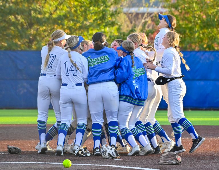 Blue Springs South softball players celebrate a 6-3 Class 5 state quarterfinal win over Ozark that earned the Jaguars a sixth trip to the state final four in the last seven years. [DAVID M. RAINEY/SPECIAL TO THE EXAMINER]
