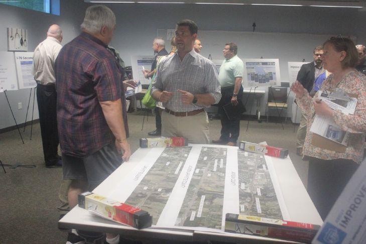 MoDOT engineer Spencer Robinson, center, explains part of the agency's I-70 expansion plans to citizens at Tuesday's open house in Blue Springs. MoDOT plans to start construction in 2024, though work in Blue Springs east to Odessa is not scheduled to start until 2025, and the whole statewide project will last until 2030. [Mike Genet/The Examiner]