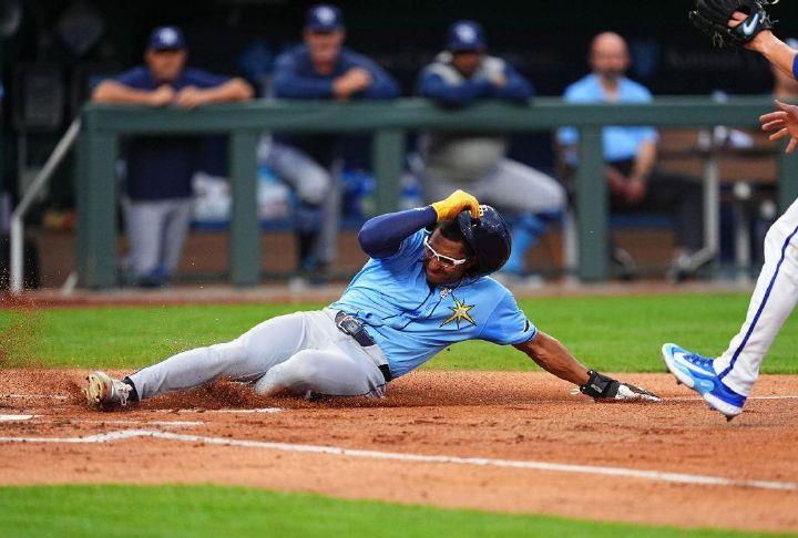 Tampa Bay's Richie Palacios scores on a wild pitch by Royals starter Brady Singer in the second inning of Tuesday's game at Kauffman Stadium. The Rays went on to a 5-1 victory in the game that was delayed 2 1/2 hours by rain. Photo Credit: Kyle Rivas/Getty Images/TNS