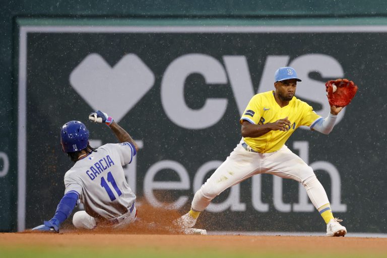 Boston Red Sox shortstop Pablo Reyes (19) gets the force at second on Kansas City Royals' Maikel Garcia (11) on a grounder by Michael Massey, who was safe at first during the first inning of a baseball game at Fenway Park, Thursday, Aug. 10, 2023, in Boston. (AP Photo/Mary Schwalm)