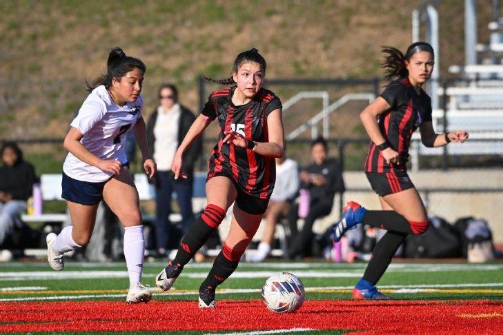 Van Horn's Adrianna Lara, center, moves the ball down field as Valeria Celedon, right, trails during a game against William Chrisman last season. Lara and Celedon return to give the Falcons legitimate scoring threats up top this season. Photo Credit: David M. Rainey/Examiner file photo