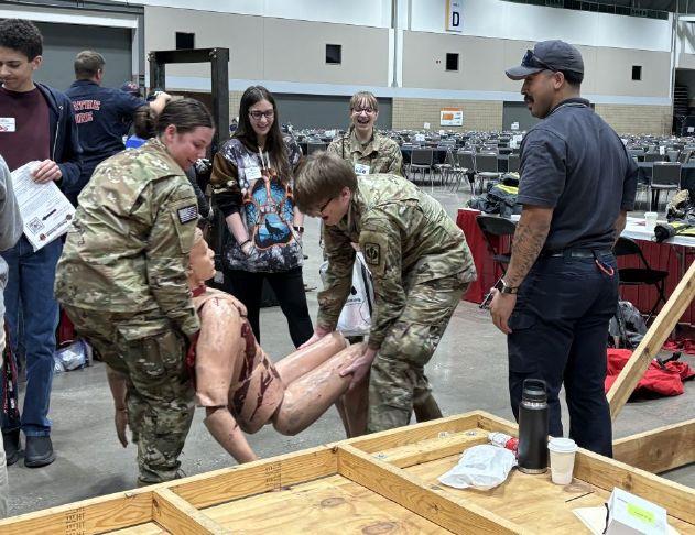William Chrisman juniors Shelby Allen and Jacob Voboril lift a dummy as part of a simulation offered by Johnson County (Kansas) Fire District No. 1 during Wednesday's Public Service Career Expo at Bartle Hall in downtown Kansas City. The Mid-America Regional Council hosts the expo every other year. [Mike Genet/The Examiner]