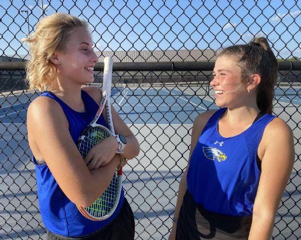 Grain Valley seniors Cate Barnes, left, and Brooklyn Spencer have plenty to smile about as they each won their singles matches and teamed up to bring home a win in No. 1 doubles. Truman defeated the visiting Patriots 7-2. Photo Credit: Bill Althaus/The Examiner