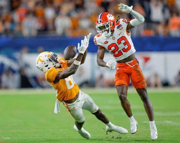 Clemson Tigers cornerback Toriano Pride Jr. (23) breaks up a pass intended for Tennessee wide receiver Ramel Keyton in a 2022 game in Miami. Pride transferred back to his home state and is expected to start for Missouri this season. Photo Credit: Al Diaz/Miami Herald/TNS