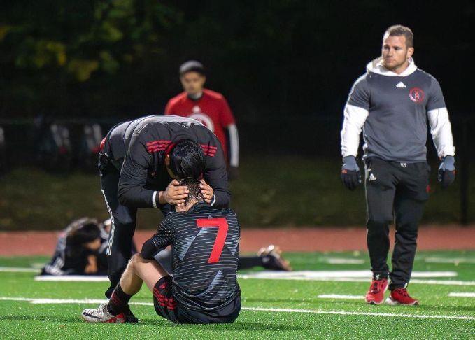 Van Horn head coach Jesus Rodriguez, left, consoles senior Justin Vest after the Falcons fell 5-2 to Kansas City East in a Class 3 state quarterfinal Saturday night at Van Horn High School. Photo Credit: David M. Rainey/Special to The Examiner