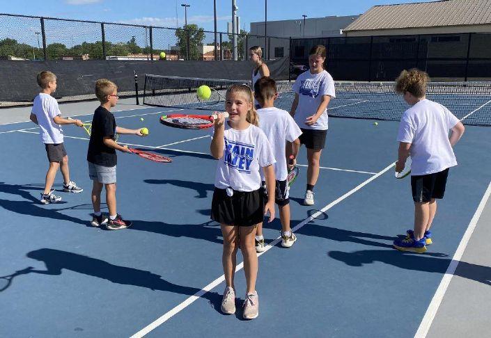 Elle Stickley, 9, works on her racket skills while her twin brother Jace, far left, volleys with The Examiner Player of the Year Finley LaForge. Emma Thiessen, who like her teammate LaForge, is an all-state player and they are helping coach Randy Draper run his annual Grain Valley High School Youth Tennis Camp. Photo Credit: Bill Althaus/The Examiner